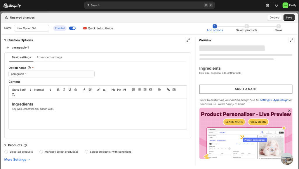 If you prefer a quicker, no-code solution, you can use an app like Easify Product Options. It lets you create additional text sections right on your product page with just a few clicks. You can easily add extra descriptions, highlight special notes, or display product details without touching any code — perfect for store owners who want flexibility and simplicity.