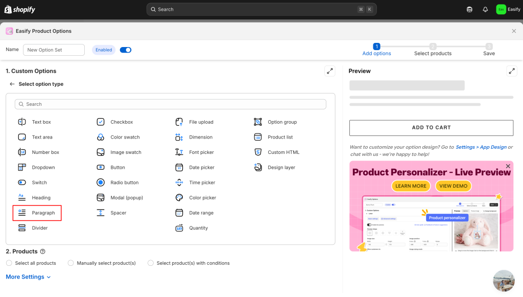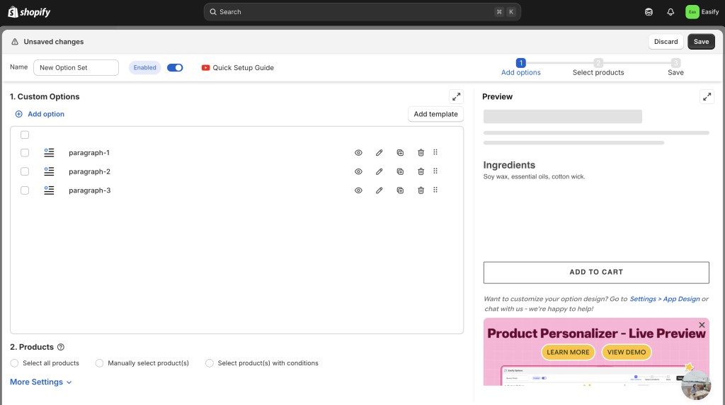 Go to the Shopify App Store, search for Easify Product Options, and click Install. Once added to your store, open the app and follow the quick setup process to get started.