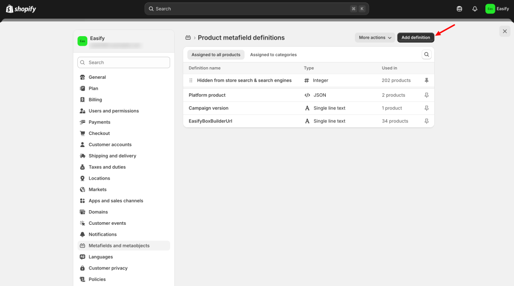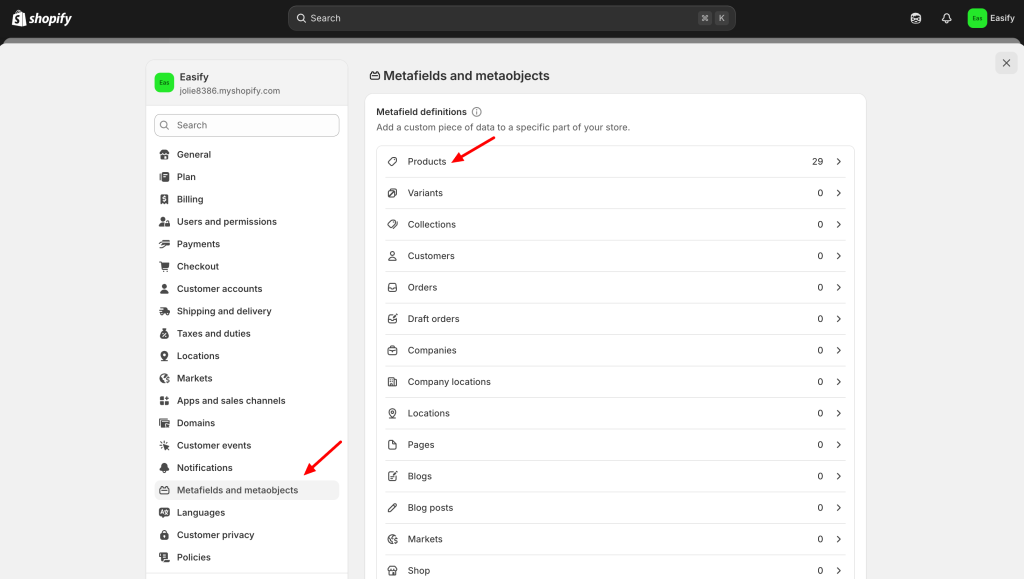 From your Shopify Admin, go to Settings → Metafields and metaobjects.