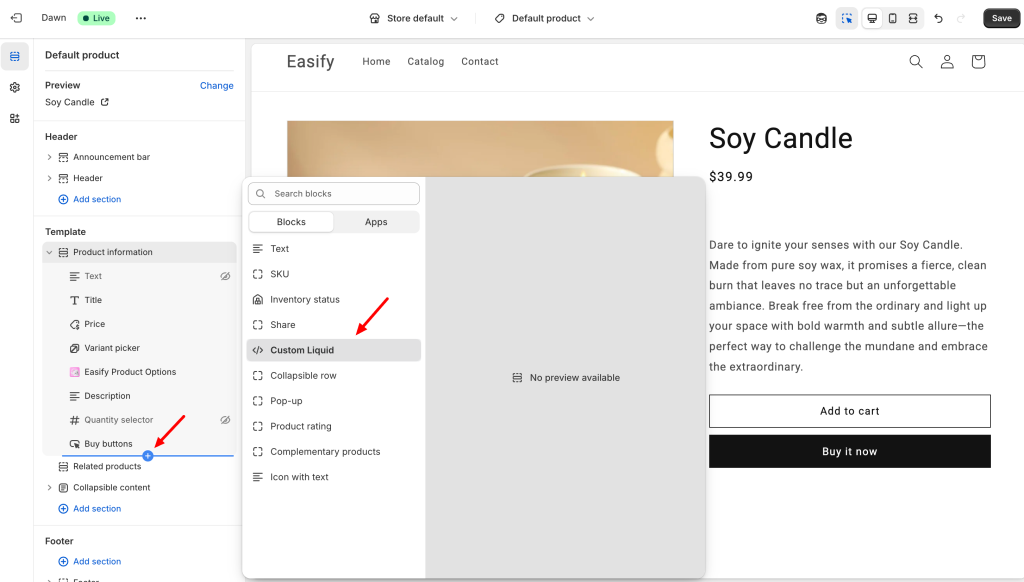 Add a new Block → Custom Liquid