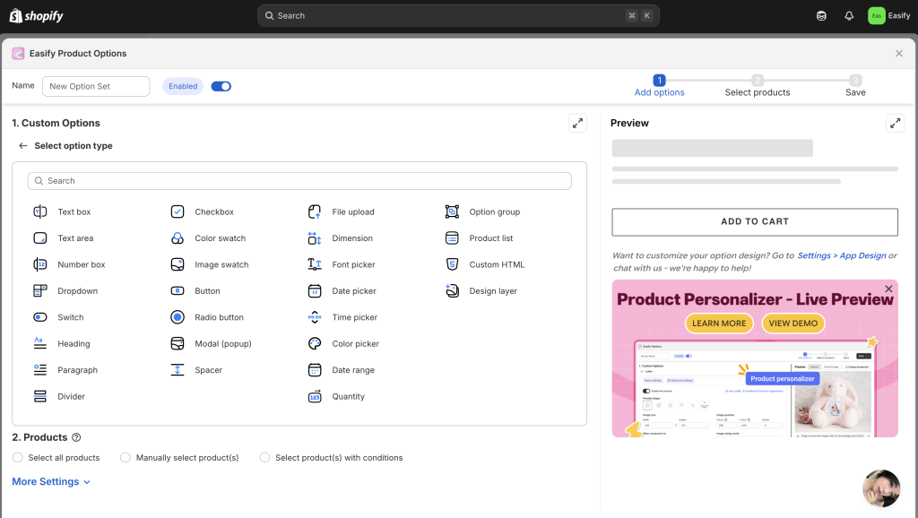Go to the Shopify App Store, search for Easify Product Options, and click Install. Once added to your store, open the app and follow the quick setup process to get started.