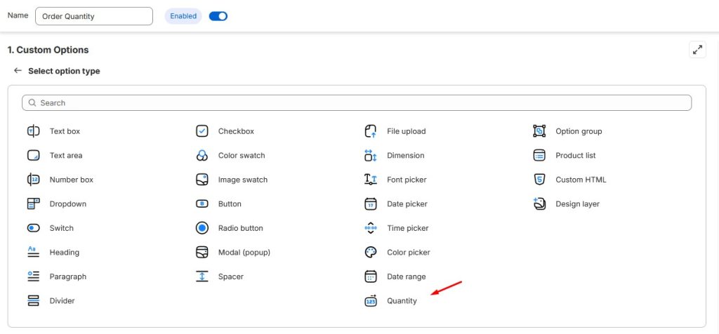 Inside the option set, click Add option, then choose Quantity as the option type.