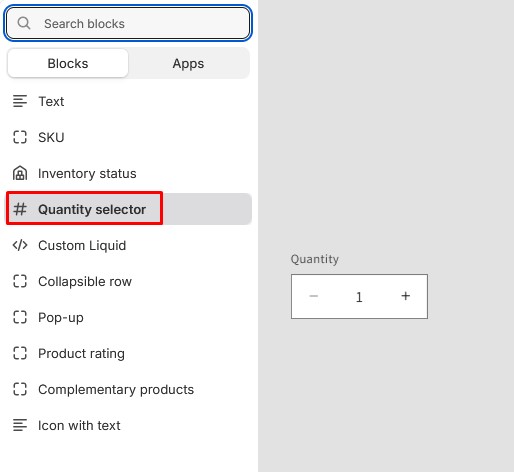 If you don’t see it, click Add block and choose Quantity selector from the list.