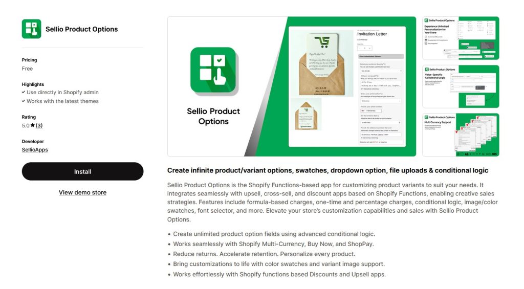 Sellio Product Options is a Shopify Functions-based app designed to give merchants extensive control over product and variant customization. The app allows you to create unlimited product option fields, including swatches, dropdowns, file uploads, and more, all while using advanced conditional logic to tailor the shopping experience.