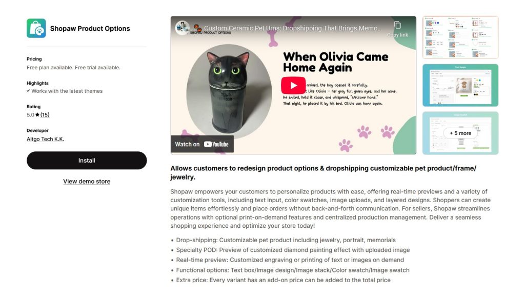 For sellers, Shopaw offers optional dropshipping and print-on-demand integrations, helping automate production and fulfillment. It’s particularly effective for stores offering customizable pet portraits, memorial gifts, or personalized jewelry, where each order requires a unique design.