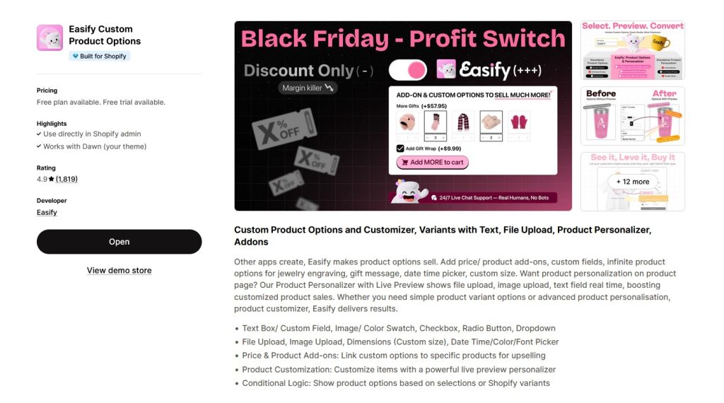 The app allows you to create unlimited product options such as text boxes, dropdowns, image swatches, color pickers, and file uploads. It’s ideal for jewelry engraving, gift messages, custom sizing, date or time pickers, and other personalized product needs.
