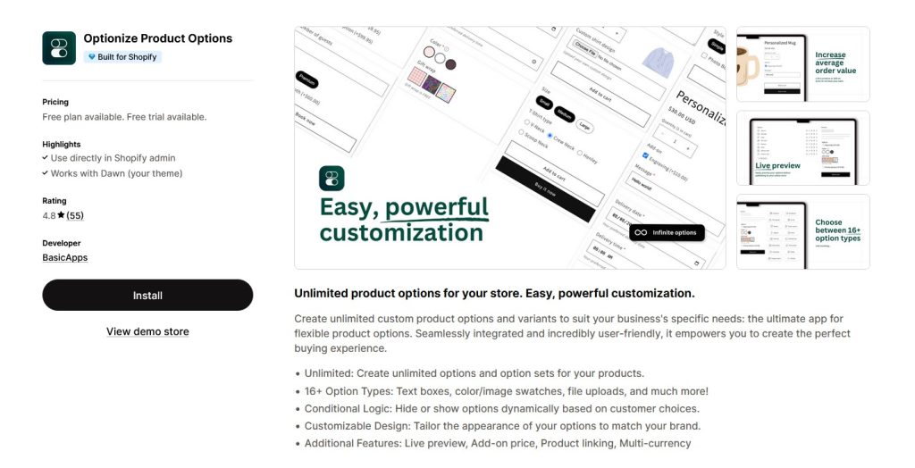 Optionize Product Options is ideal for Shopify merchants looking for a powerful, versatile app to create a fully customized shopping experience without the complexity of manual coding.