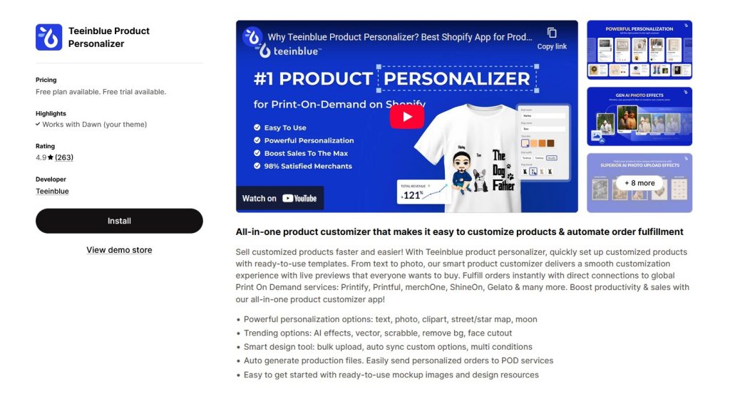 Teeinblue Product Personalizer is an all-in-one solution for Shopify merchants looking to sell customized products efficiently. The app simplifies product personalization by allowing you to set up ready-to-use templates and provide a smooth live-preview experience for customers, helping boost conversions and sales.