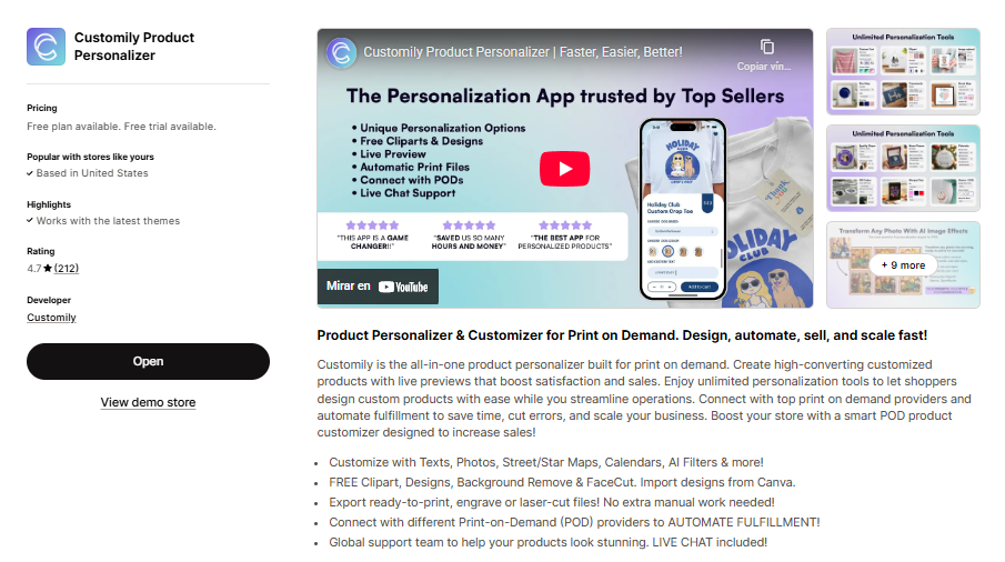 | Customily Product Personalizer | Smart solution for stores selling advanced personalized products | Live previews, unlimited tools, AI effects & mockups, conditional logic, automatic production files with POD integrations. | Ideal for scaling personalized products with professional visuals, trending customization options and hands-free fulfillment, giving shoppers a smooth design experience and merchants a faster workflow. |