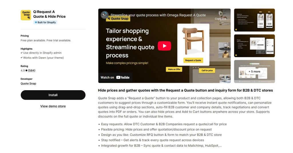 Not every product is ready for a one-click purchase. For B2B stores, custom orders, or high-ticket items, customers often need to request a quote before buying. QuoteSnap Request A Quote & Hide Price gives Shopify merchants the flexibility to handle these scenarios seamlessly, improving the buying experience while protecting pricing strategies.