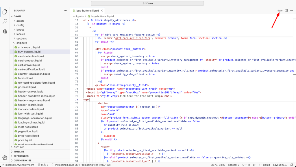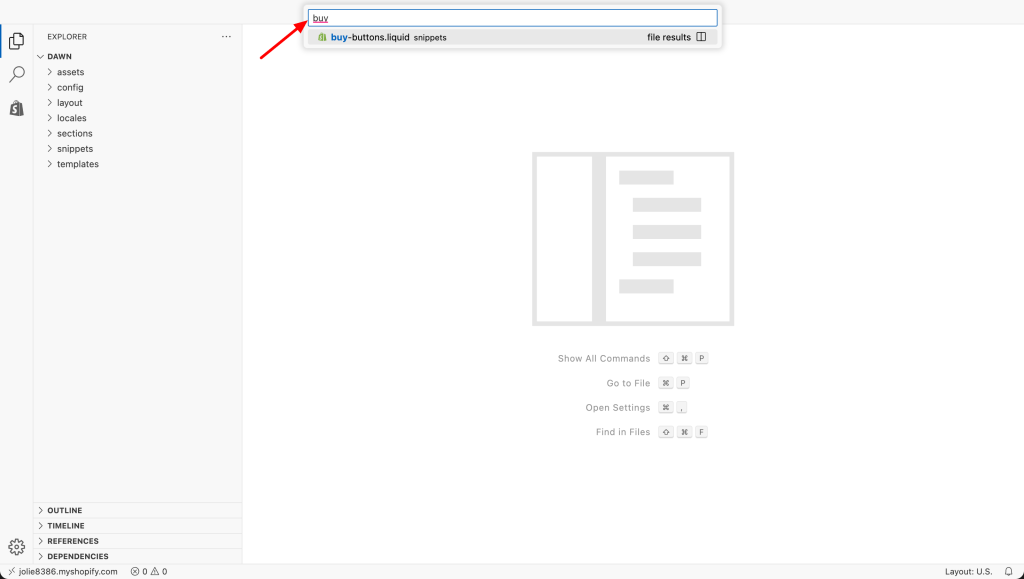 In the search bar on the left side, type buy-buttons.liquid to locate the file, then click to open it.