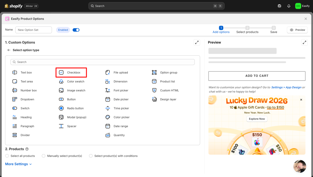 From your Easify dashboard, click the Add New Option Set button. Next, select Checkbox.