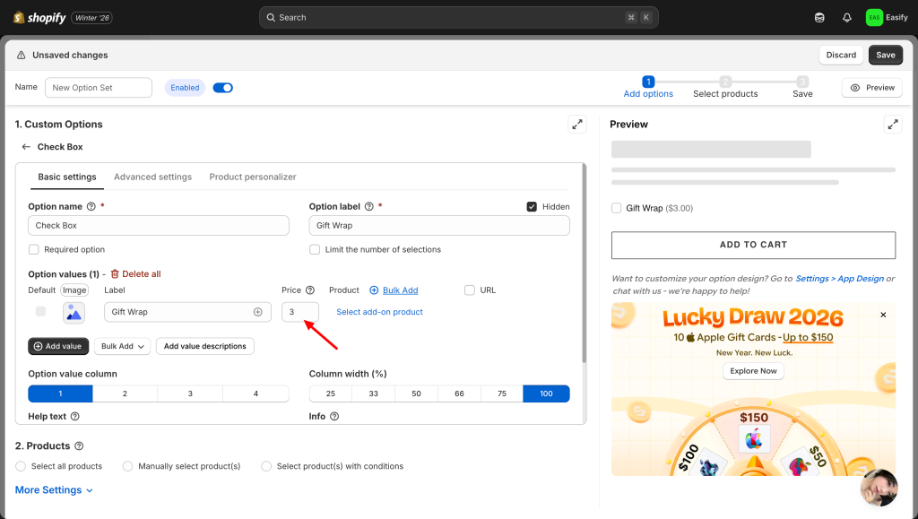 Click on the checkbox option you just created to open its settings. Here, you can enter the label text and optionally set an add-on price (e.g., adding $3 for “Gift Wrap”).