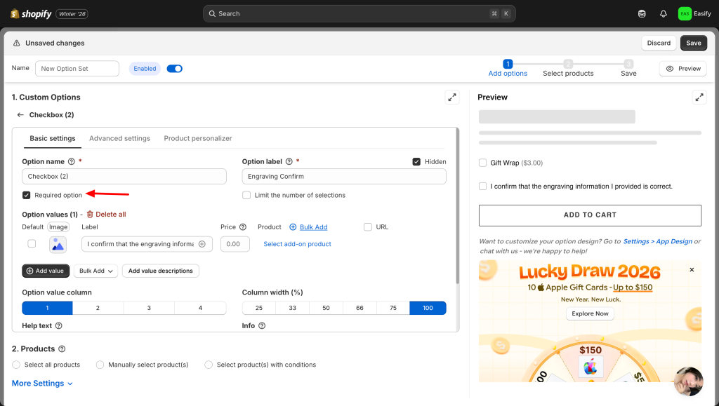 If this is a mandatory step, such as “Engraving Confirm” when you learn how to add an engraving option on Shopify, make sure to select the Required option. This ensures customers must tick the box before they can add the item to their cart.