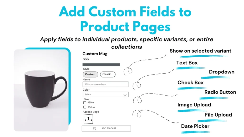 - Multiple input types: text fields, dropdowns, checkboxes, swatches