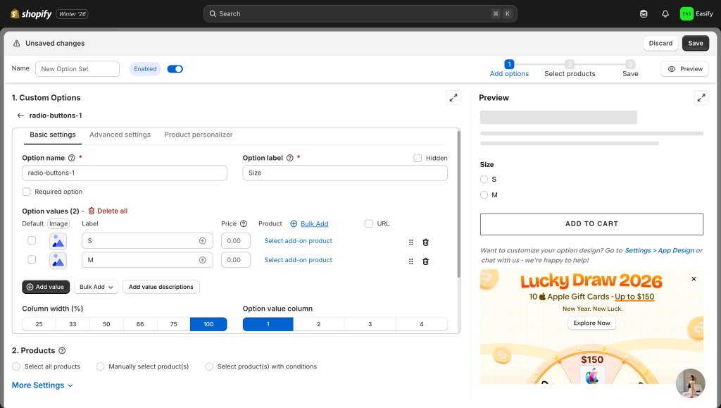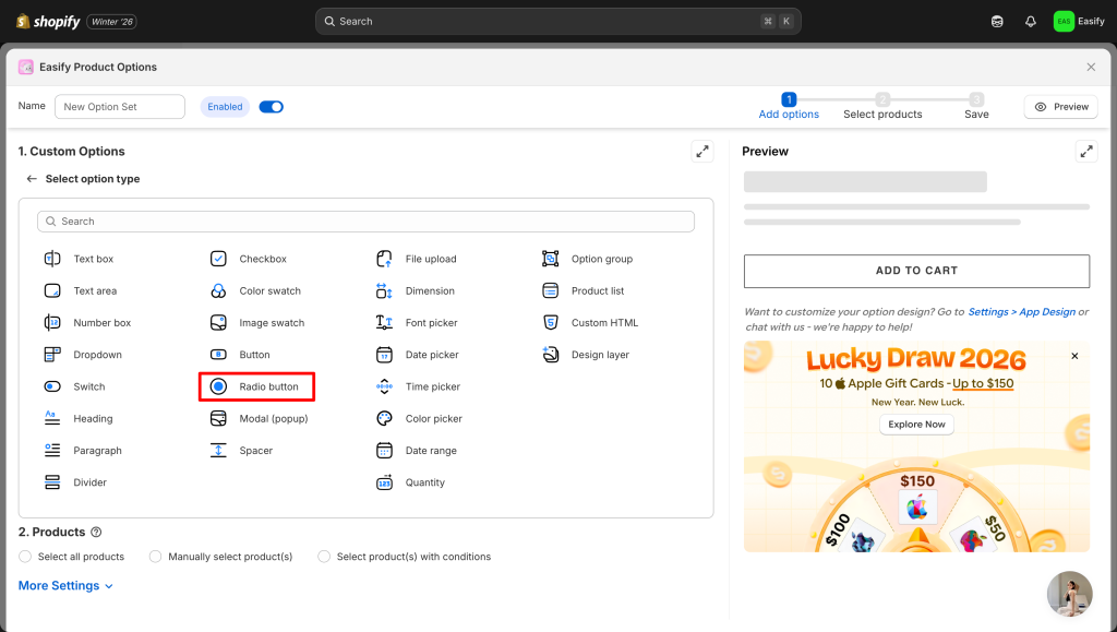 Easify Custom Product Options allows you to add professional radio buttons in minutes without touching a single line of code, ensuring a seamless setup that integrates perfectly with your store’s theme.