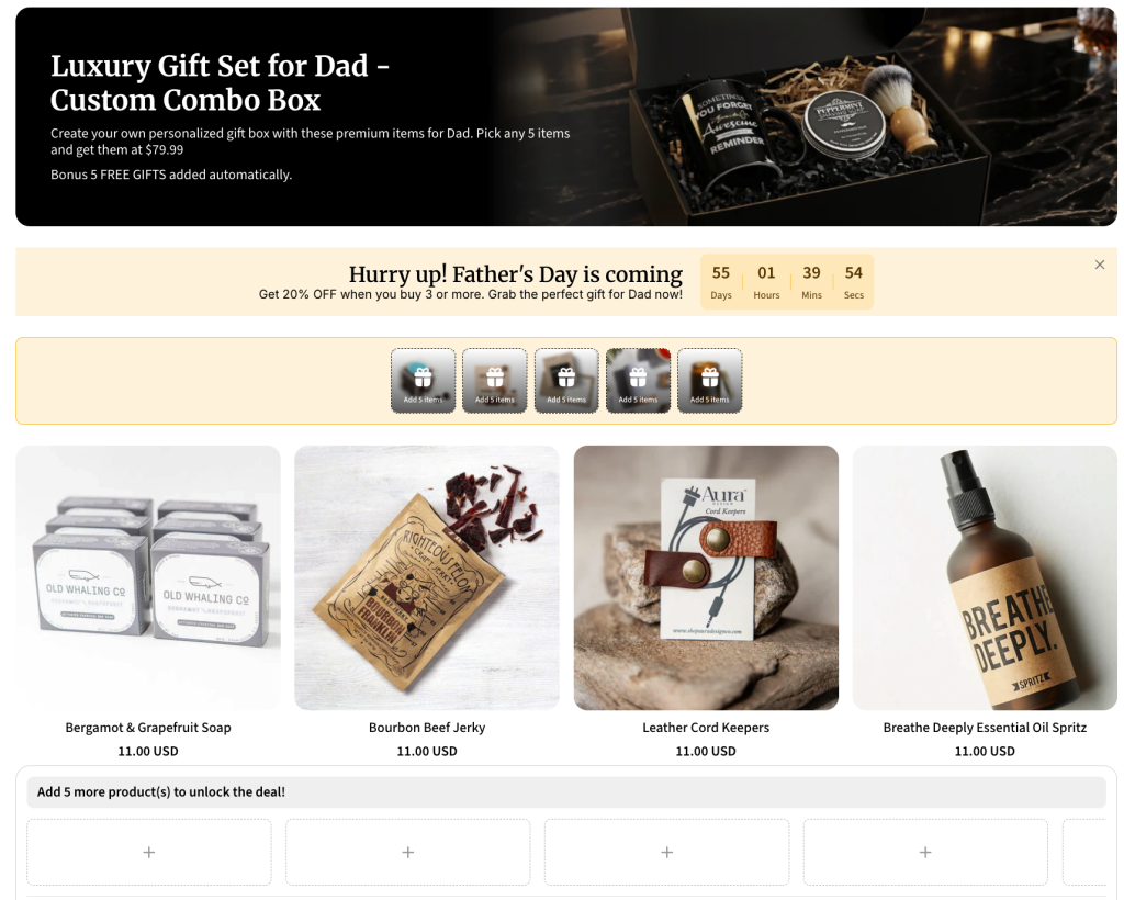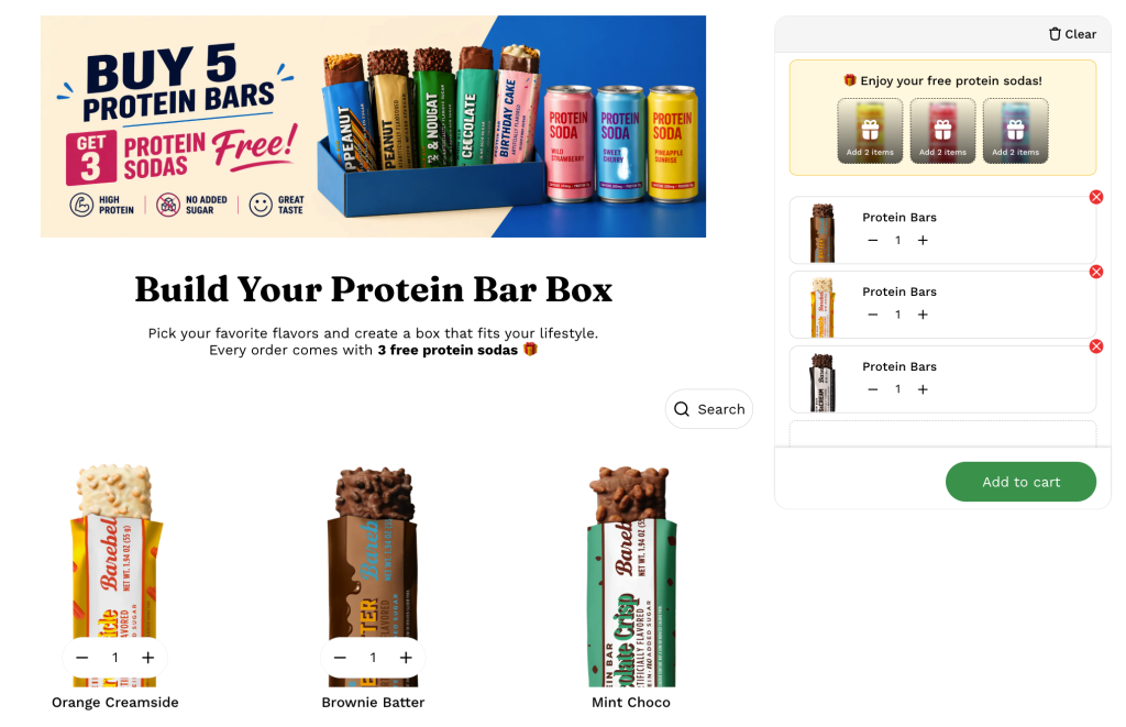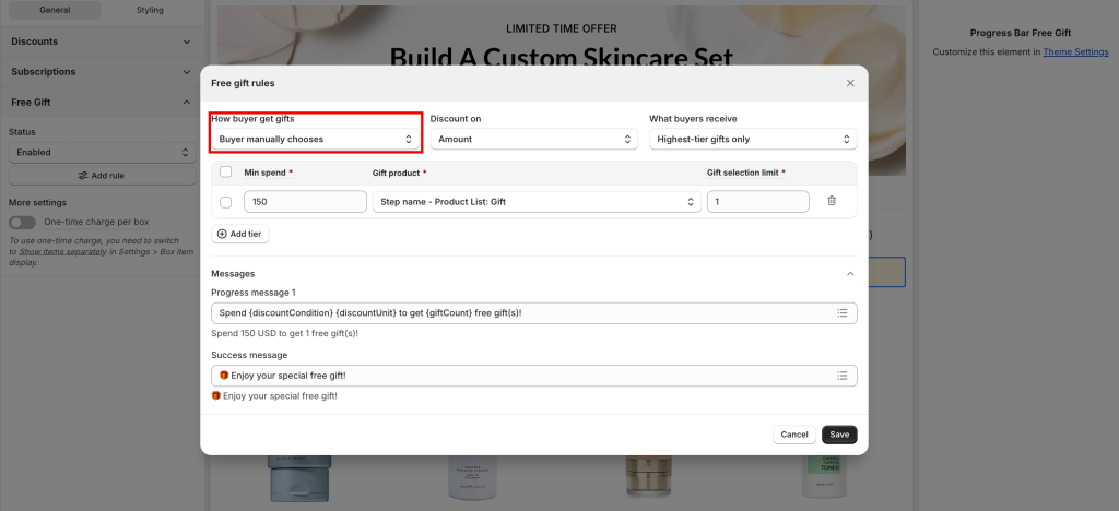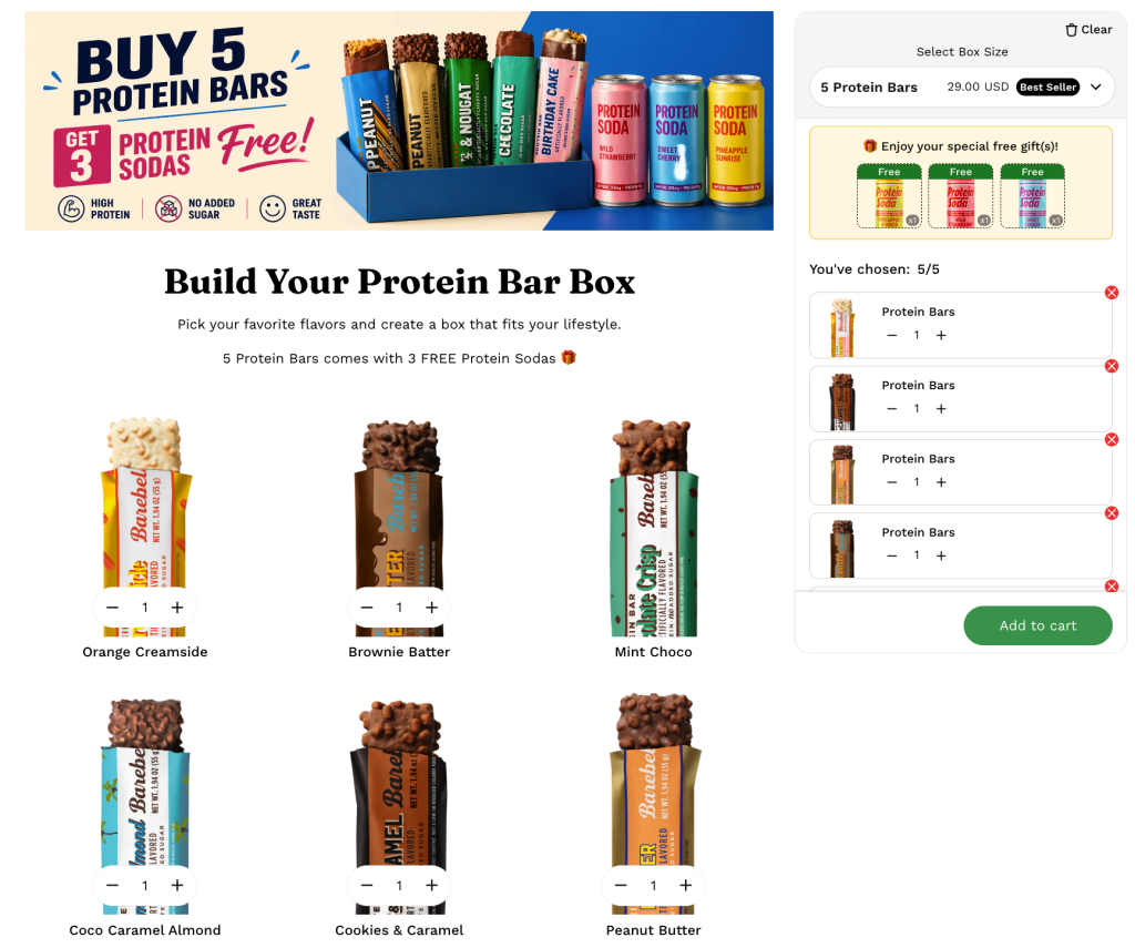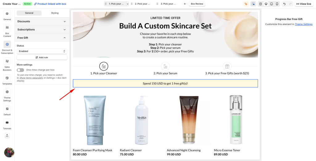 In addition to setting up the logic, it’s important to clearly communicate the offer to customers. The Free Gifts Bar helps highlight available rewards and motivates customers to unlock them as they build their box.