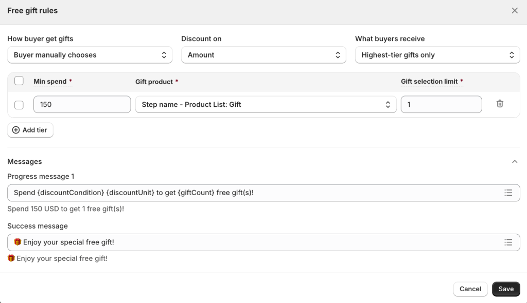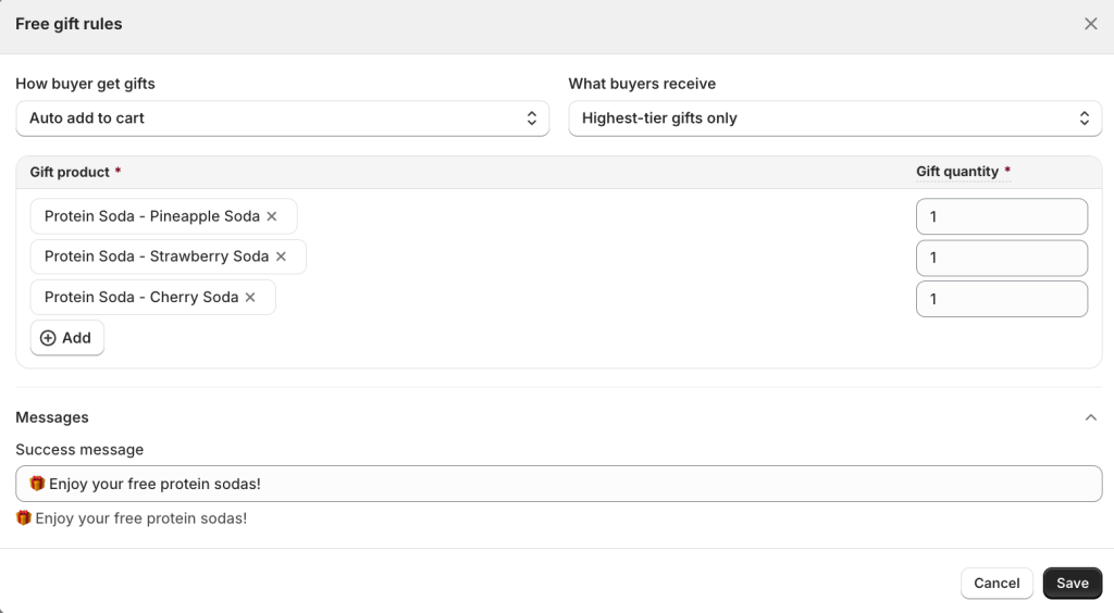 👉 Gifts will be displayed in the Free Gifts Bar. You will configure this in a later step.