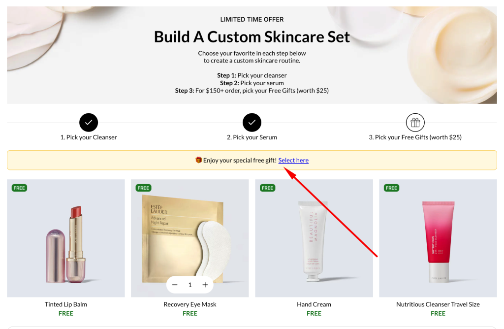 When customers qualify, they can click from the bar to choose their gift in this list.
