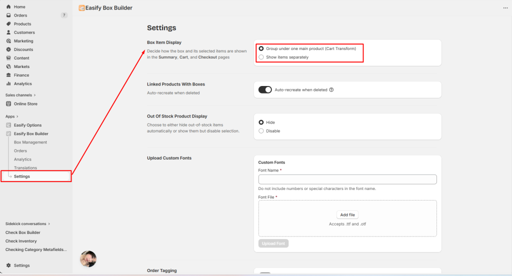 - In your Easify Box Builder app admin, go to Settings.