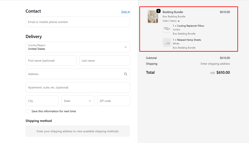 | Checkout Display | Bundled items grouped under one main product in Checkout | Each item in the bundle listed individually in Checkout |