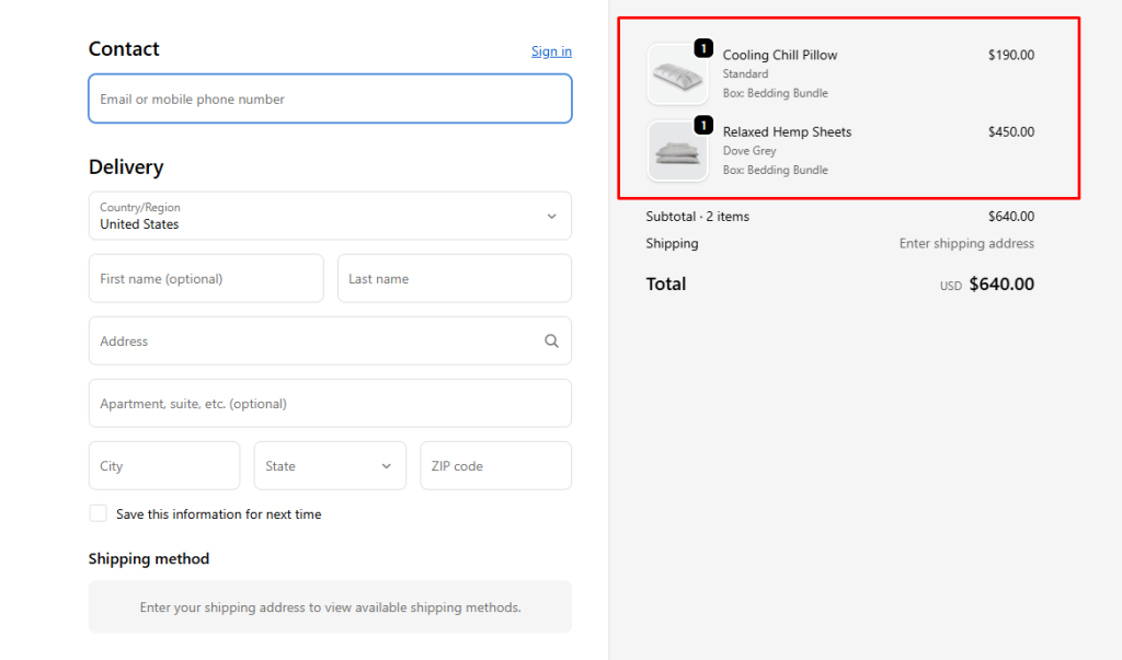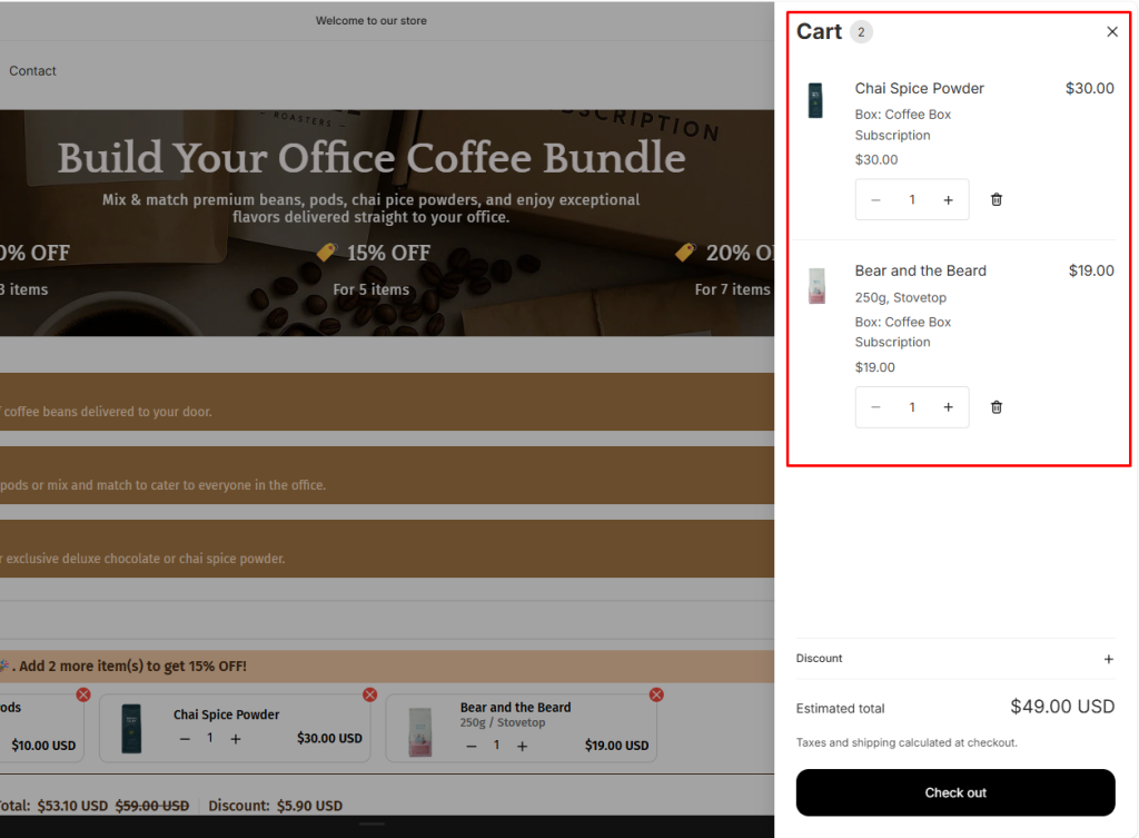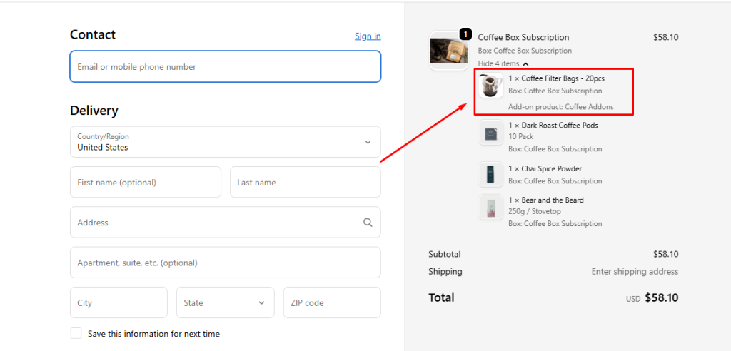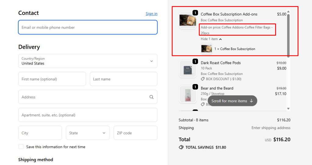 - Example: For a Coffee Box Bundle, if customers select coffee filter bags as an addon, they will be displayed right under the main product in checkout.