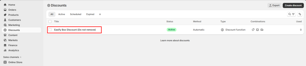 - An Easify Box Discount is also automatically created in your Shopify Discount Admin.