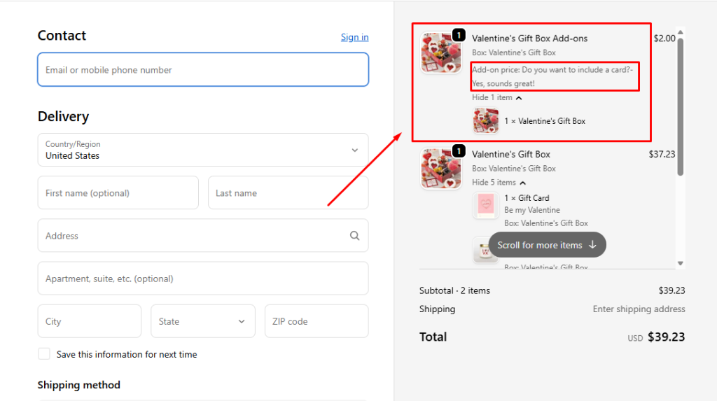 - Example: For a Valentine’s Gift Box, if customers choose to add a gift card (with an additional fee), a new product called Valentine’s Gift Box with the addon price will appear in checkout.