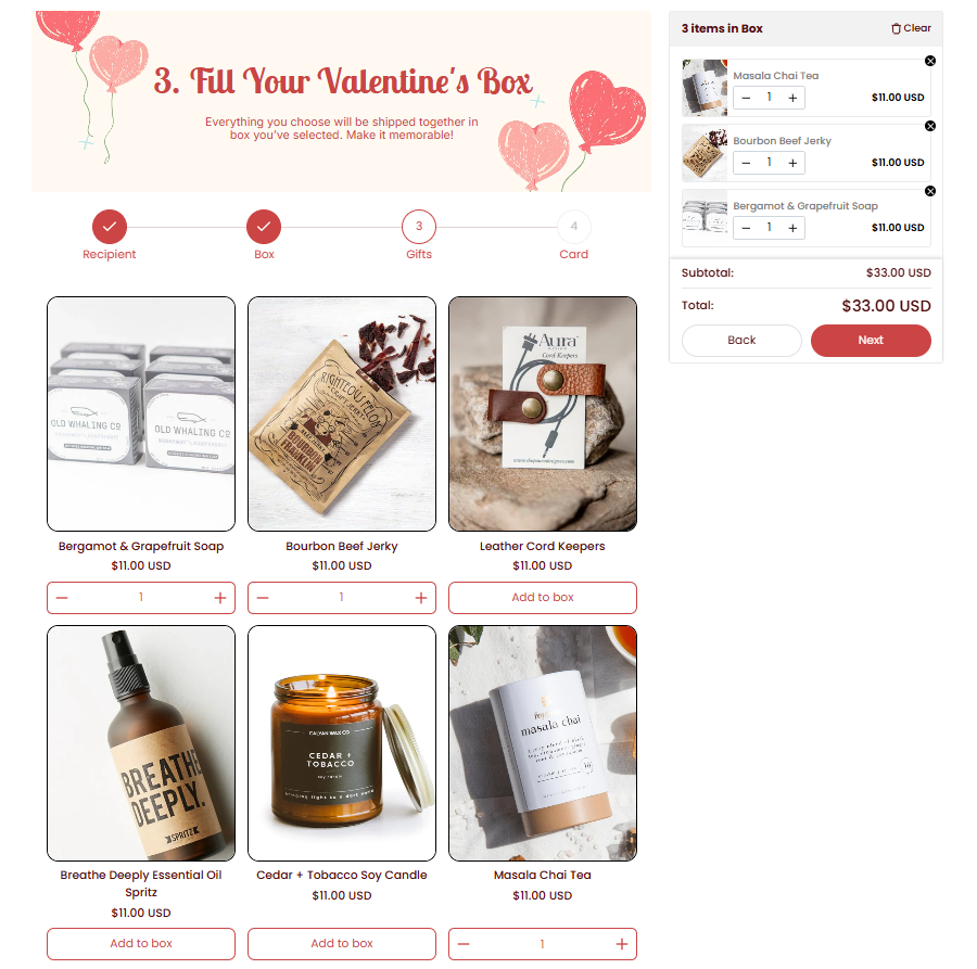 - Result: Based on the selection, the builder dynamically updates the product list to show items that best match the chosen recipient.