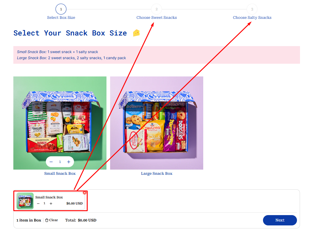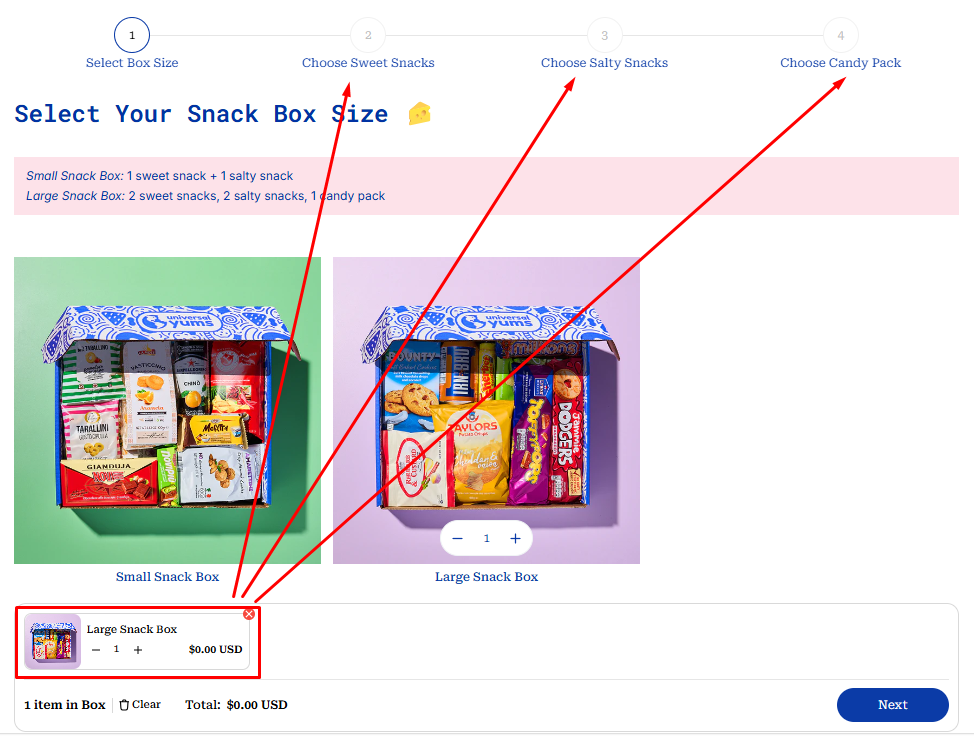 - Condition: Selecting a box size (Small Snack Box & Large Snack Box).