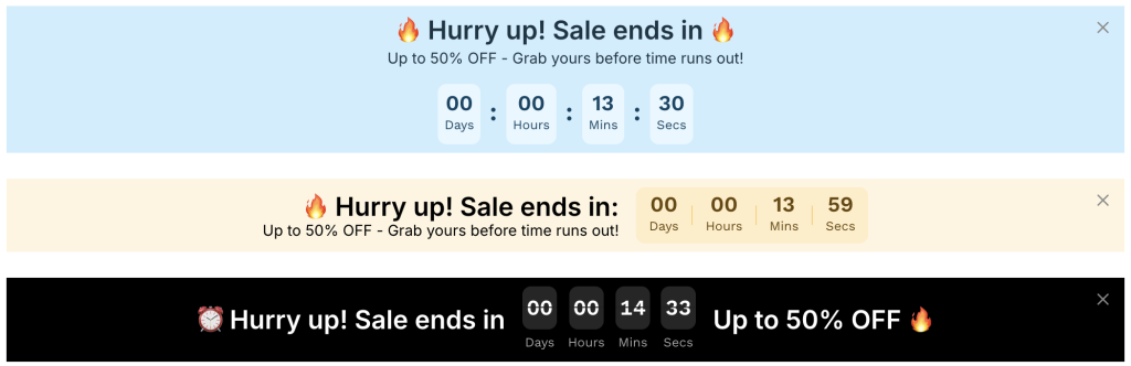 - Each banner comes with pre-set text and a timer.