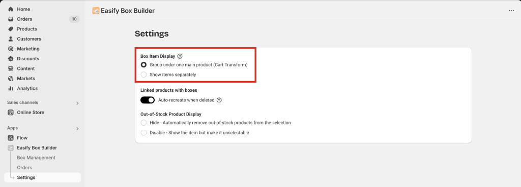 Note: Easify Box Builder enables Cart Transform by default in Settings. If you prefer to show selected items separately, you can disable this feature anytime in Settings.