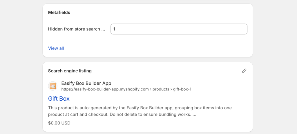 Change visibility: By default, the app hides the linked product from site search and search engines. To make it visible, go to the Metafields section of the product details and change the value of “Hidden from store search…” from “1” to “0”. Additionally, you can update the Search engine listing settings (SEO title and description) as needed to improve visibility on search engines.