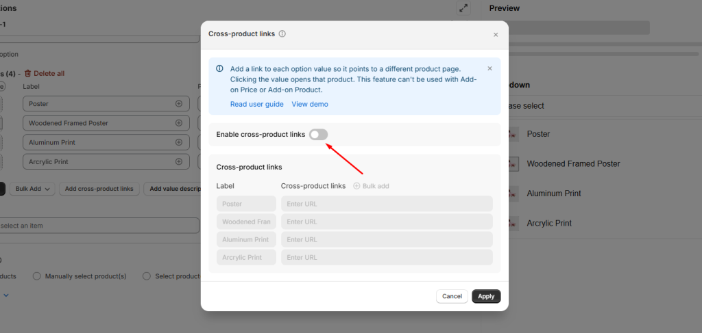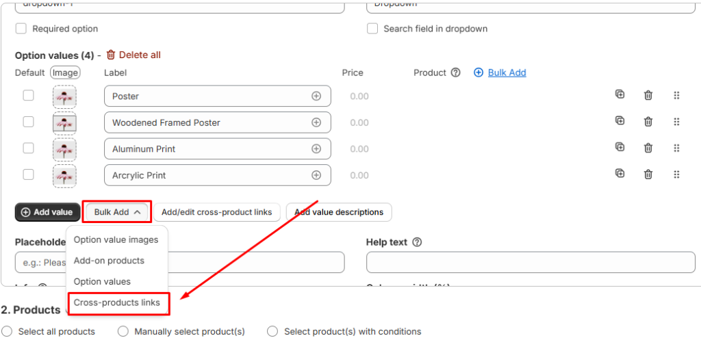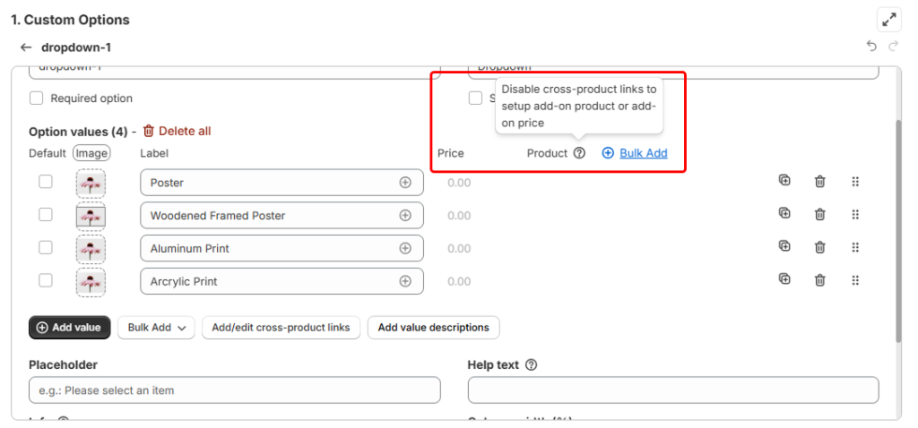 Notes: Enabling the Cross-product links feature disables the Add-on Price & Add-on Product features, as these options are created solely for cross-product linking purposes, not as product options for the main product.
