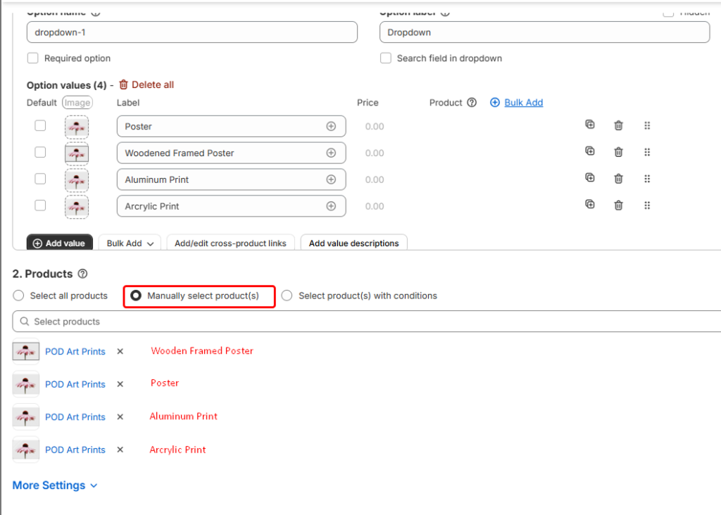 Manual Selection: If you’re working with a small group of products that share something in common, manual selection is the way to go. Simply choose each product individually and link it to the option set. For instance: