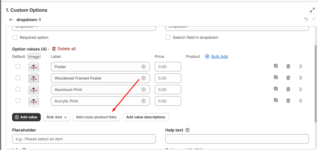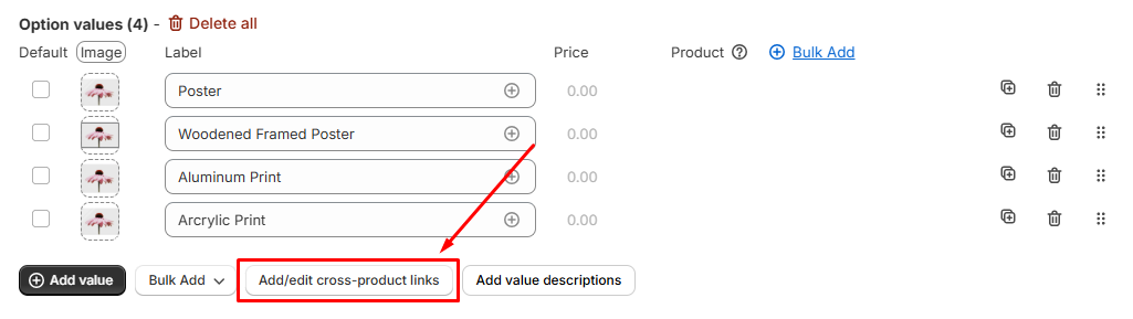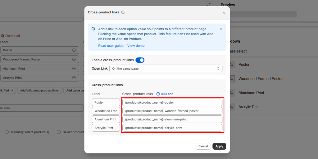 Enter the exact URLs: For instance, you can input the full URL “https://easify-product-options.com/products/echinacea-purpurea-poster” or a shortened version (excluding the site domain) such as “/products/echinacea-purpurea-poster” for the “Poster” option value.