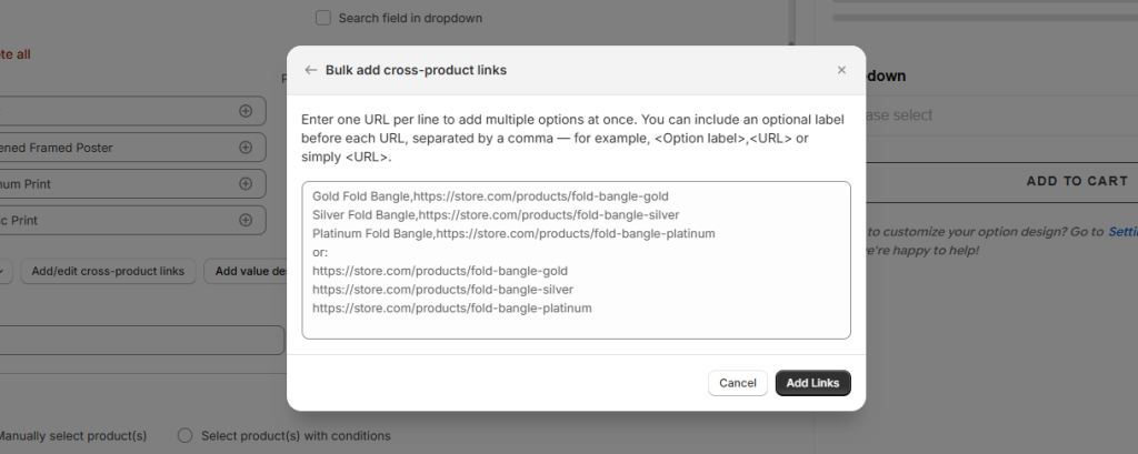 ℹ️Note: When you use Bulk Add to insert links, it will automatically create new options in the option set. If you have a large number of cross‑product links, it’s best to use Bulk Addbefore adding or editing options in the option set.