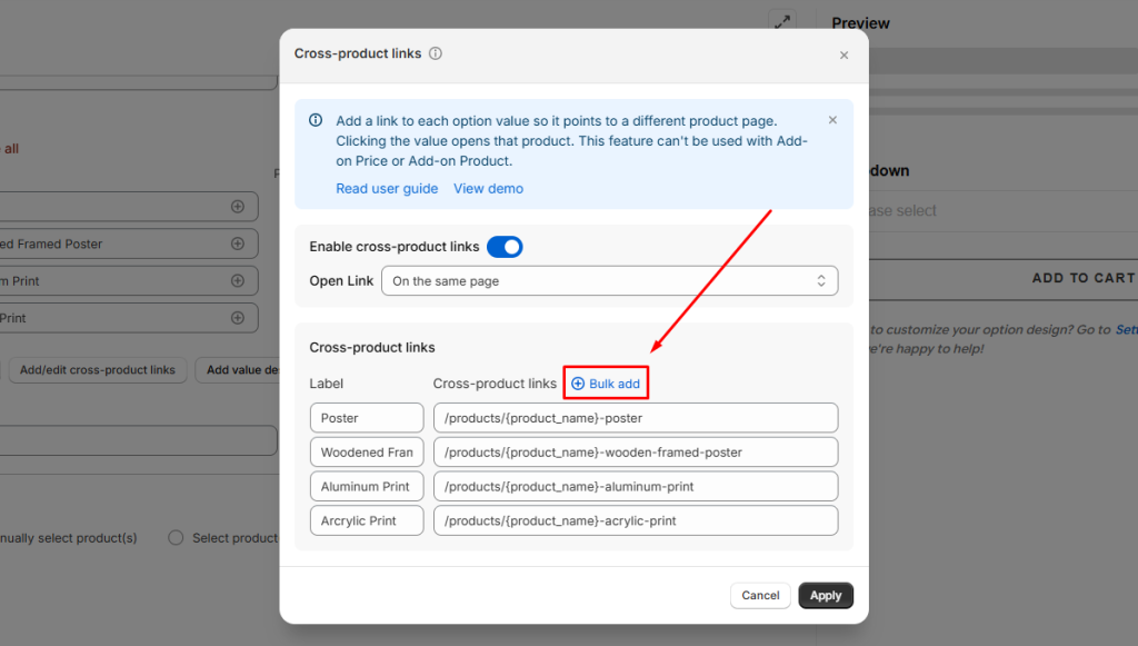 In the Cross‑product links popup, select Bulk Add