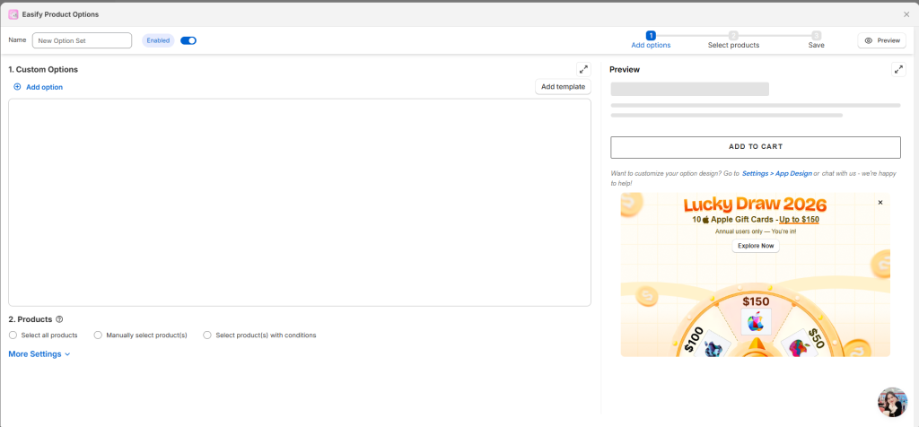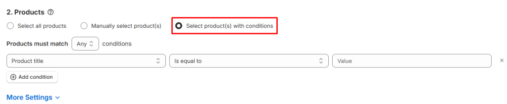 Automatic Selection: For a larger pool of products, you can leverage the power of conditional product assignment. This allows for seamless bulk assignment of the option set based on predefined criteria. For instance, you can set conditions to apply the option set to products within specific collections or of certain product types. This method pairs perfectly with setting up URLs with {product_name} variables in Step 4, streamlining the cross-product linking setup process for efficiency and accuracy.