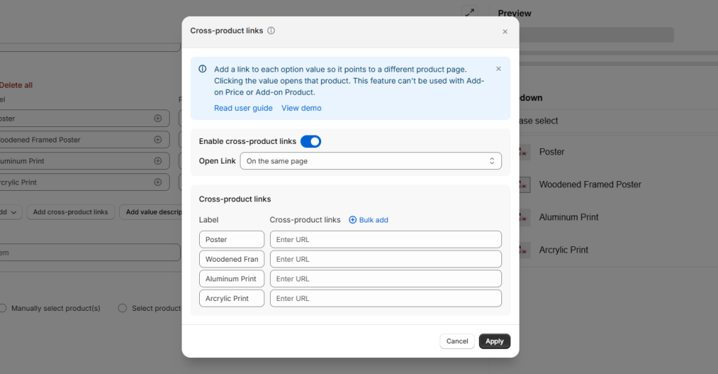 Linked Separate Products In Print-on-Demand (POD) Stores: In POD stores, it’s common for multiple product types to share the same custom design. However, merging or combining these products into one using Shopify variants isn’t feasible due to restrictions imposed by POD apps, which can only process orders with separately generated products from the apps. Addressing this challenge, the Cross-product Links feature offers a solution by linking products with identical designs, presenting them as options on each product page while maintaining their status as separate entities.