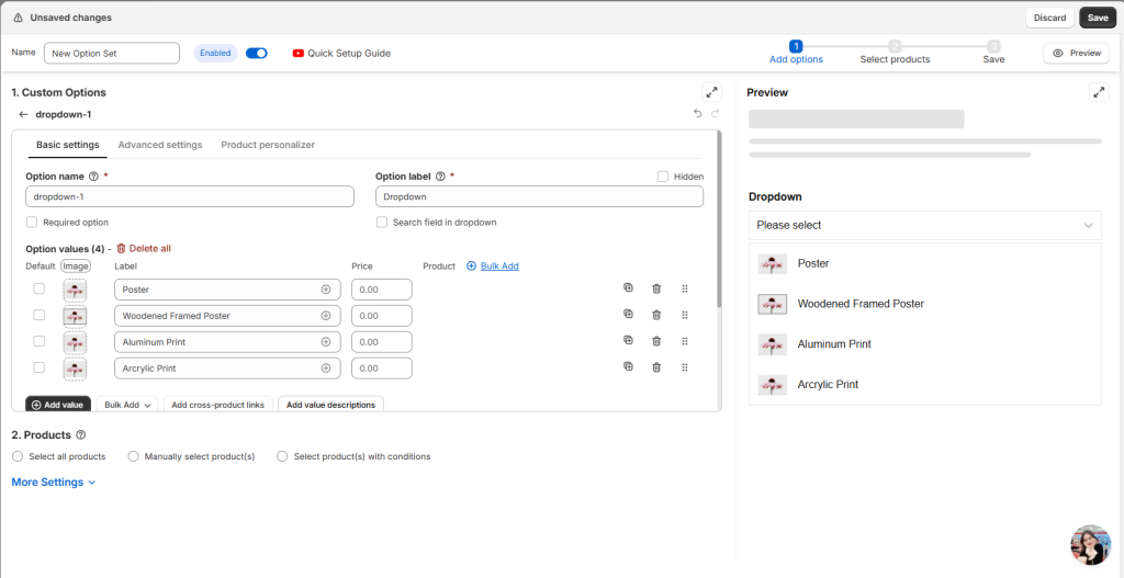A common case: Suppose your store sells 100 art prints, each with 4 print types. By utilizing the second approach of employing {product_name} variables, you can streamline your process by creating just 1 option set for all art print products sharing the same print types, rather than creating a separate option set for each individual art print.