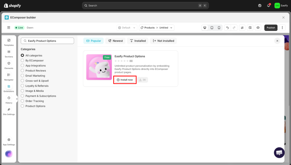 A popup will appear, where you can search for Easify Product Options. Once you find it, simply click the Install Now button to add the widget to your available elements.