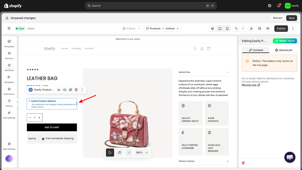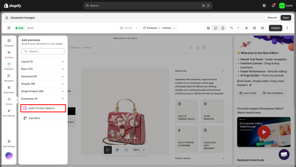 - Easify Product Options extension only works on the live page. You may not see the functional options directly inside the EComposer editor preview.