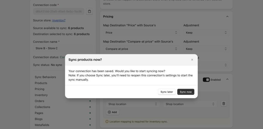 When syncing inventory, Source store locations must be mapped to Destination store locations. Inventory cannot sync without location mapping.