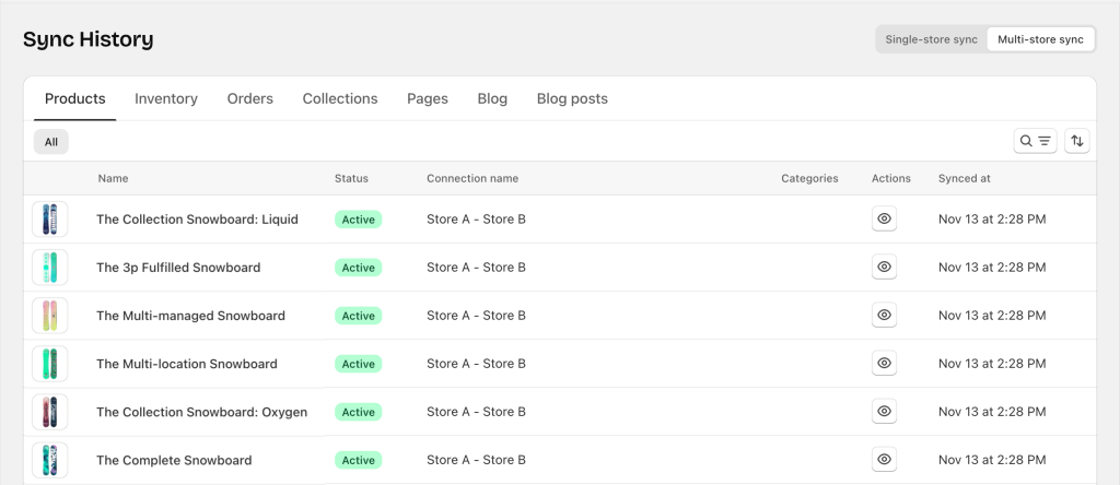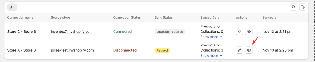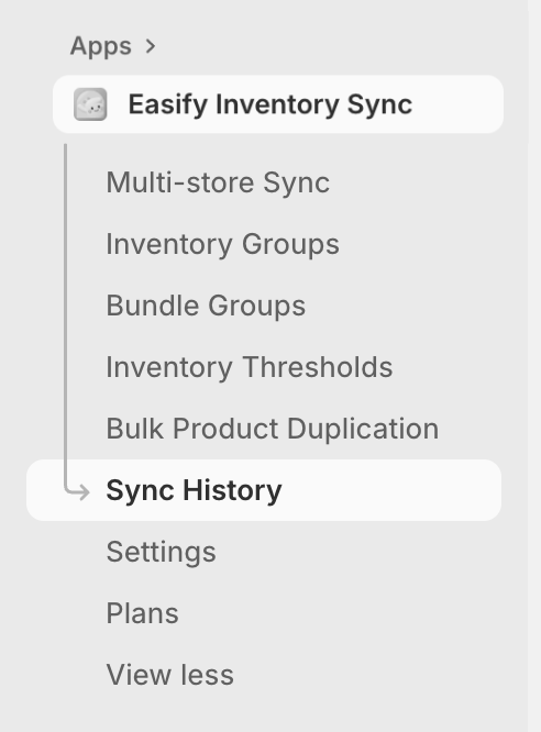 Sync History is available on both the Source and Destination stores. It lets you review all items synced between your connected stores, including what was synced, its details, and the exact time each sync occurred.