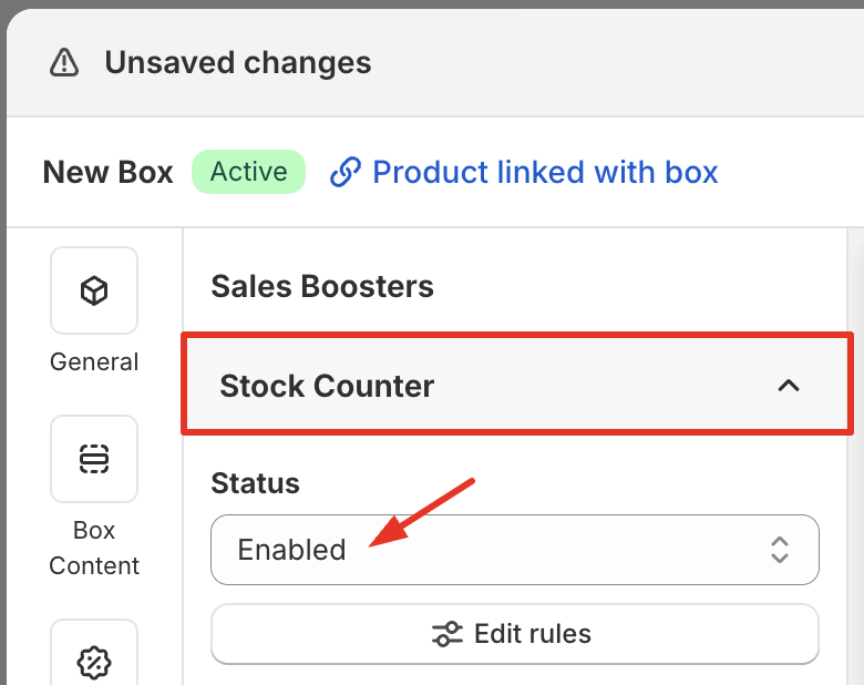 Navigate to the Sales Boosters tab in your left-hand menu, expand the Stock Counter section, and change the status to “Enabled”.