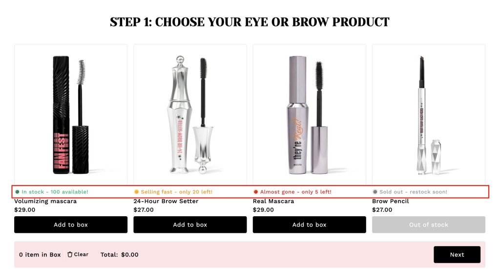 When a customer is faced with 50+ items in a box builder, they often freeze. Data shows that scarcity narrows focus. A Low Stock Counter acts as a “visual magnet”, helping the customer choose the high-demand items first. It simplifies the decision-making process by identifying which choices are time-sensitive.
