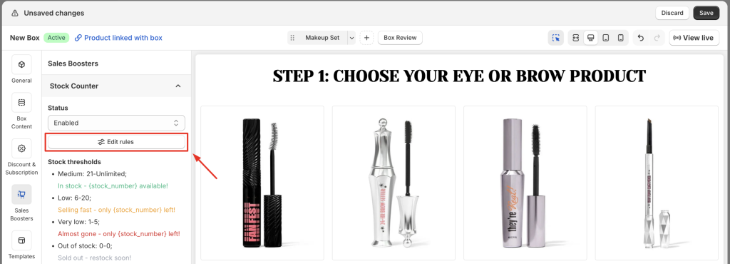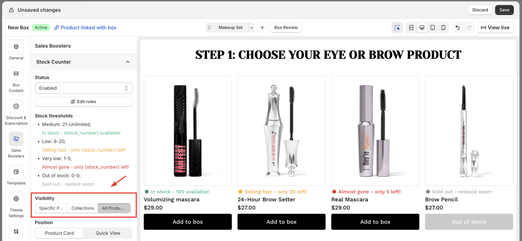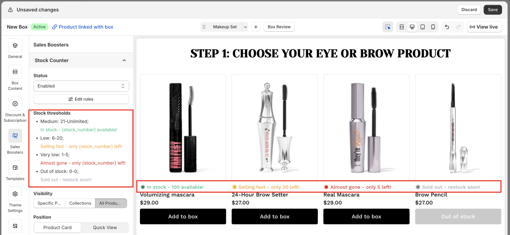It is a real-time inventory indicator integrated directly into your box-building interface. Unlike a simple “Out of Stock” message that stops a sale, this counter acts as a strategic early-warning system. It appears on your Product Cards or within the Quick View Popups to signal that availability is shrinking.