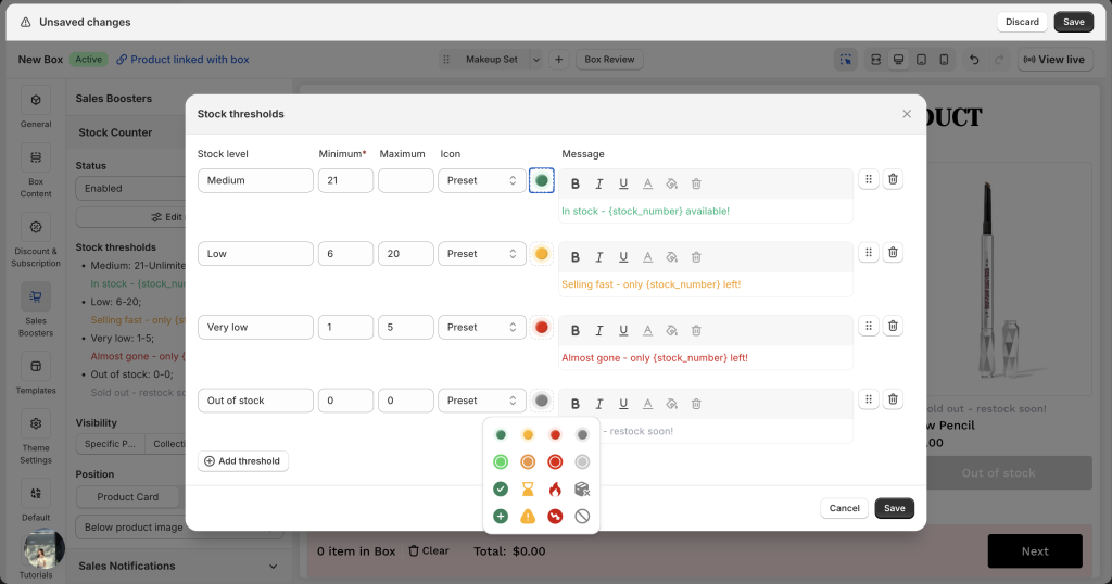 - Visual Alignment:Â Customize the badge colors, icons, and styles to ensure the alerts look like a native, premium part of your box page design.