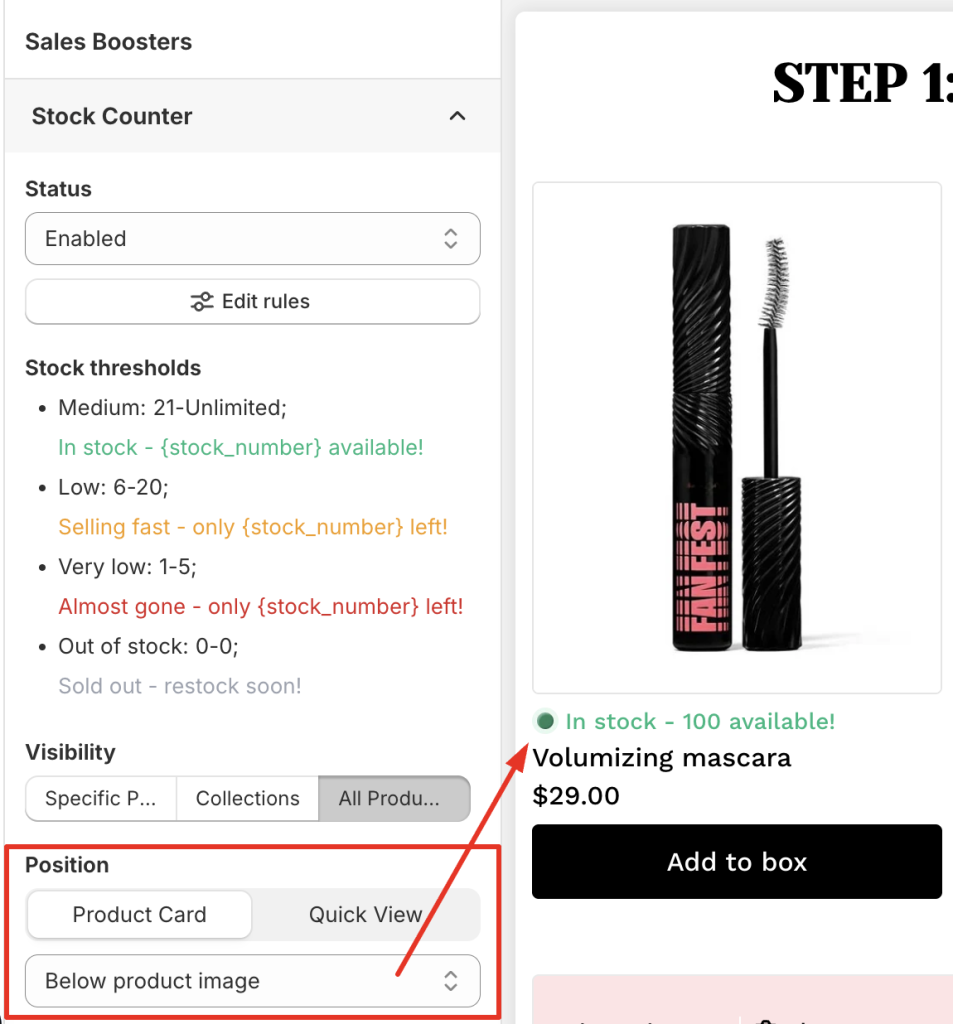 - Selection Logic: Choose to display stock levels for all products, specific collections, or only your most exclusive items.